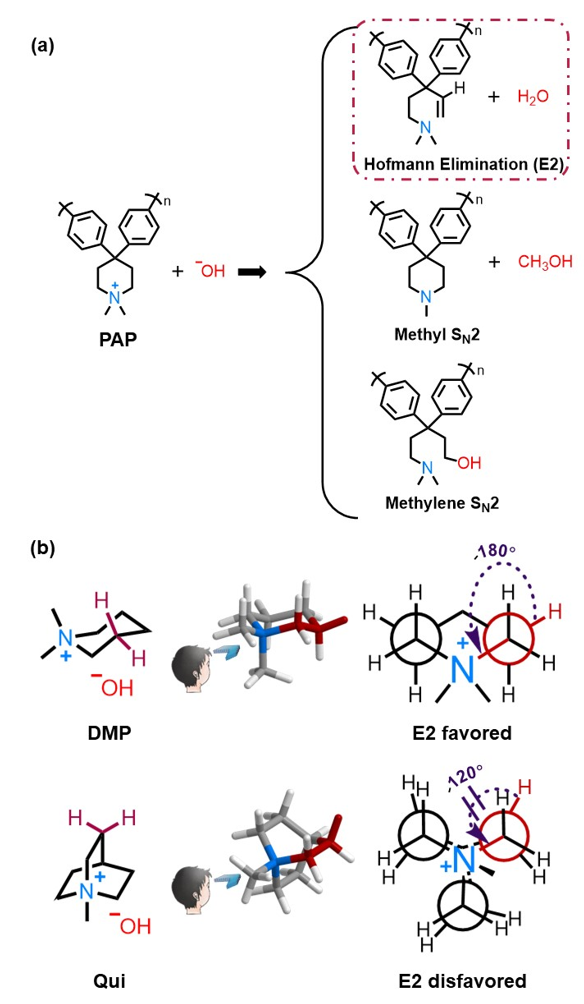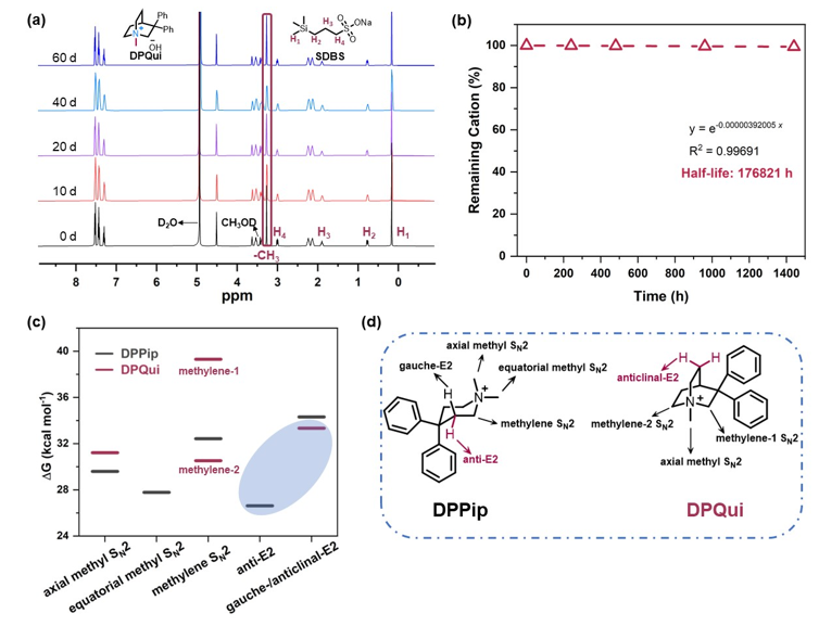 该工作首先从模型小分子二苯基奎宁(DPQui)出发,通过小分子加速老化实验和理论计算验证了DPQui的高碱稳定性(图2)。并且通过与二苯基哌啶小分子进行比较,作者发现DPQui中的桥环结构显著地提升了E2消除反应的能垒,增加了碱稳定性。