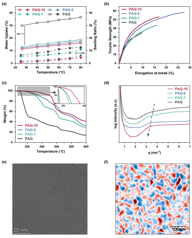 为探究该PAQ-x的基本性质,分别通过测试其吸水率(WU)、溶胀率(SR)、应力拉伸、热重对所制备的聚合物进行分析,加入共聚单元三苯基苯的聚合物具有更优异的性能,特别是PAQ-5展现出更好的综合性能(80ºC: WU(17.36%)、SR(6.25%))(图4a-c)。随后通过小角X射线散射(SAXs)、透射电镜(TEM)和原子力显微镜(AFM)对聚合物的相分离进行研究,通过AFM清晰地看出PAQ-5的相分离结构(图 4b-d)。
