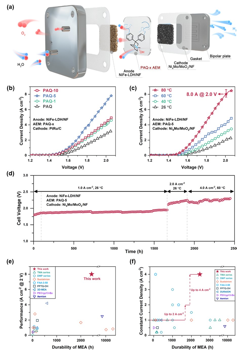研究团队开发了一种用于高性能水电解的支化型聚芳基奎宁(PAQ)的稳定阴离子交换膜(AEM),为AEM的创新开发提供更多可能性,并加速了AEM电解水的产业化进程。