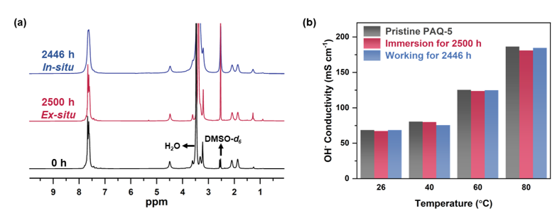 碱性稳定性是AEM-WEs长期运行的关键特性。在此之前,奎宁环小分子的稳定性已经得到证实。为了进一步揭示PAQ-5的碱性稳定性,作者分别在1 M KOH溶液80 ℃下浸泡和在电化学器件中测试,进行了原位和非原位的碱稳定性测试。如图6a所示,在4.5-7.0 ppm之间和8.5 ppm以上没有明显的新峰出现,展现出PAQ-5超高的稳定性;图6b也展现了PAQ-5没有明显的离子损失,OH-电导率维持98.99%,其电导率的保留率高于文献报道的其他AEMs。