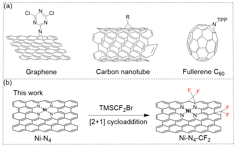 图1. (a) 通过[2+1]环加成反应修饰了官能团的石墨烯、碳纳米管和富勒烯(TPP = 三苯基卟啉);(b) 通过[2+1]环加成反应在Ni-N4-CF2表面引入二氟亚甲基官能团的示意图(TMS = −SiMe3)