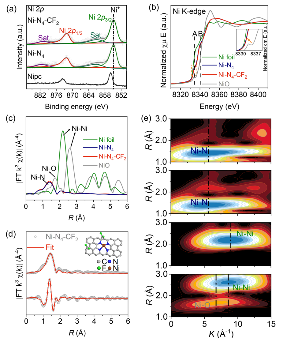 图3. (a) Ni-N4-CF2、Ni-N4和Nipc的高分辨率XPS Ni 2p光谱;(b) Ni-N4-CF2和Ni-N4的Ni-K边XANES光谱(Ni foil和NiO作对比);(c) Ni-N4-CF2和Ni-N4-CF2以及对比样品在Ni-K边的FT-EXAFS拟合图;(d) Ni-N4-CF2的FT-EXAFS拟合图;(e) Ni-N4-CF2、Ni-N4、Ni foil和NiO的WT-EXAFS图