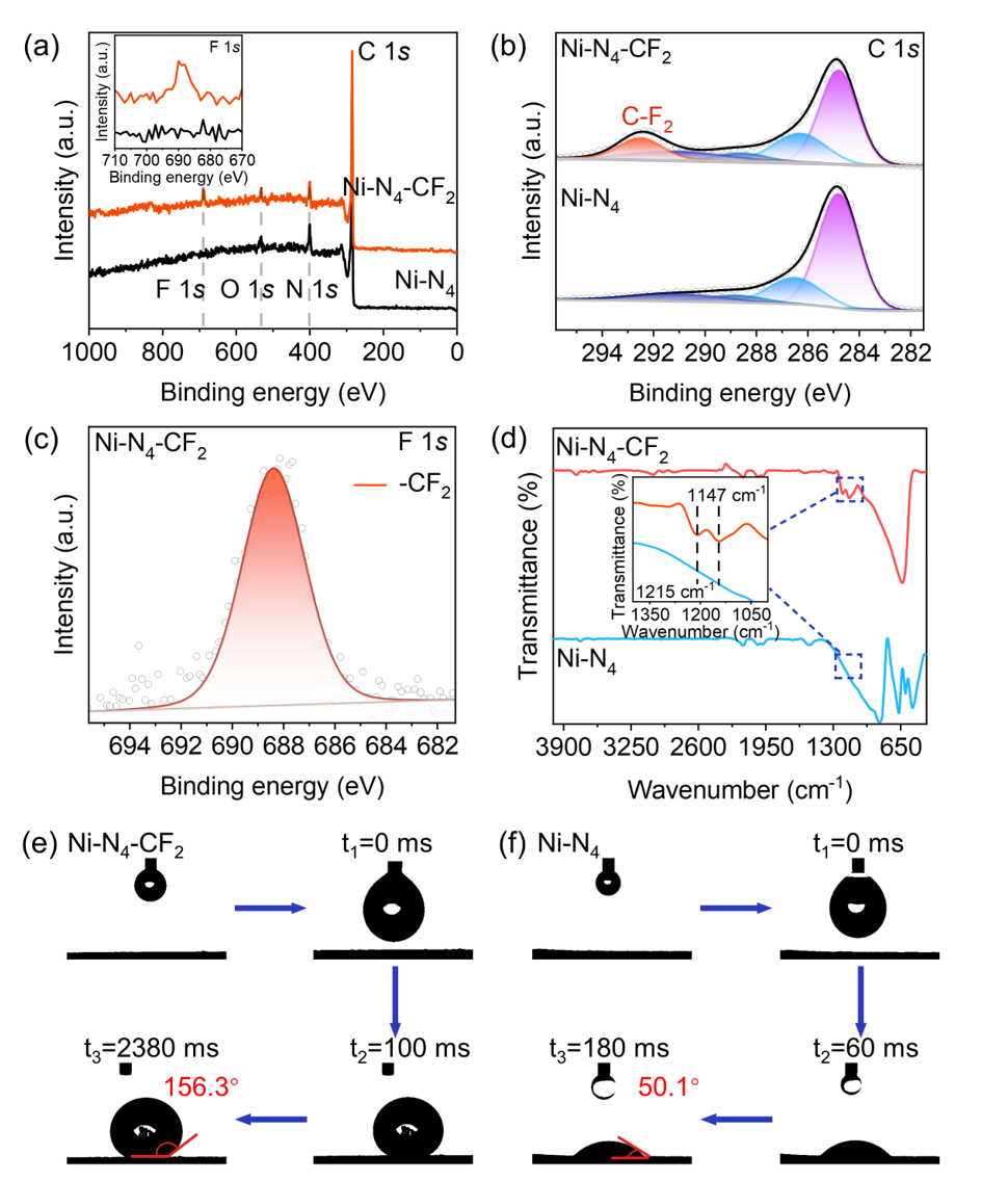 图4. (a) Ni-N4-CF2和Ni-N4的XPS光谱;(b) Ni-N4-CF2和Ni-N4的高分辨率XPS C 1s光谱;(c) Ni-N4-CF2的高分辨率XPS F 1s光谱;(d) Ni-N4-CF2和Ni-N4的FT-IR光谱;(e) Ni-N4-CF2和(f) Ni-N4的接触角测试