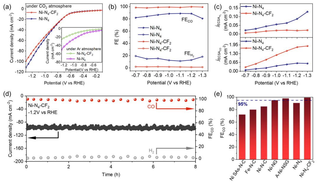 图5. (a) 催化剂的LSV曲线;(b) CO或H2的FEs;(c) ECSA校正的Ni-N4-CF2和Ni-N4在不同施加电位下的分电流密度图;(d) Ni-N4-CF2在−1.2 V vs RHE电位下的长时间测试;(e) Ni-N4-CF2和Ni-N4与其他先进CO2还原产CO催化剂的比较