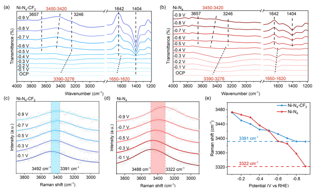 图6. (a) Ni-N4-CF2和(b) Ni-N4在−0.1 ~ −0.9 V电位范围内的原位ATR-SEIRAS光谱;(c) Ni-N4-CF2和(d) Ni-N4在−0.1 ~ −0.9 V的电位范围内的原位SHINER光谱;(e)不同施加电位下H−O拉伸模式振动峰的拉曼位移图