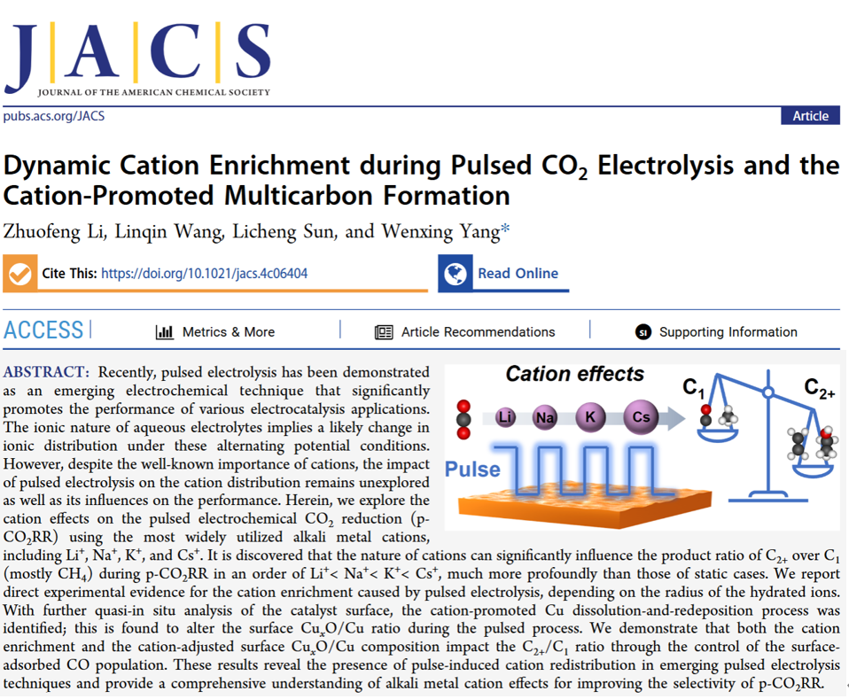 近日,西湖大学理学院、人工光合作用与太阳能燃料中心杨汶醒课题组在《Journal of the American Chemical Society》上发表了题为“Dynamic Cation Enrichment during Pulsed CO2 Electrolysis and the Cation-Promoted Multicarbon Formation”的研究成果。