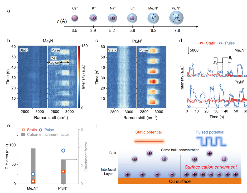 在此基础上,研究团队通过时间分辨原位电化学拉曼对脉冲放大CO2RR中阳离子效应的机理进行了研究。由于碱金属阳离子没有拉曼特征峰,因此该工作使用有机阳离子模拟碱金属阳离子在脉冲过程中的动态调控。通过将阳离子拉曼峰强度在恒电位下与脉冲电位下进行对比,发现阳离子的拉曼峰在脉冲电化学的还原段显著增强,说明脉冲电位可以引起电极表面的阳离子富集。进而通过比较具有不同尺寸的阳离子的富集效果,发现小水合离子半径的阳离子受脉冲电位的富集作用更加明显(图2)。