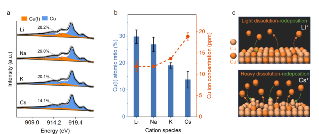 除了由脉冲电位引发的阳离子富集作用,该研究也发现电极表面结构的动态变化具有明显的阳离子依赖性。铜表面准原位X射线光电子能谱(ex-situ XPS)结果表明,随着阳离子尺寸的增加,脉冲CO2RR中还原段下Cu(I)的原子比由Li+中的30.6±2.8%单调下降至Cs+的13.5±2.6%(图3a 和 3b)。另外,反应后溶液的电感耦合等离子质谱(ICP-MS)测试结果显示,越大的阳离子,Cu离子的溶解量越多。因此,存在一种受阳离子环境影响的Cu析出-重沉积机制,在脉冲过程中可以影响铜催化剂的表面结构(图3c)。