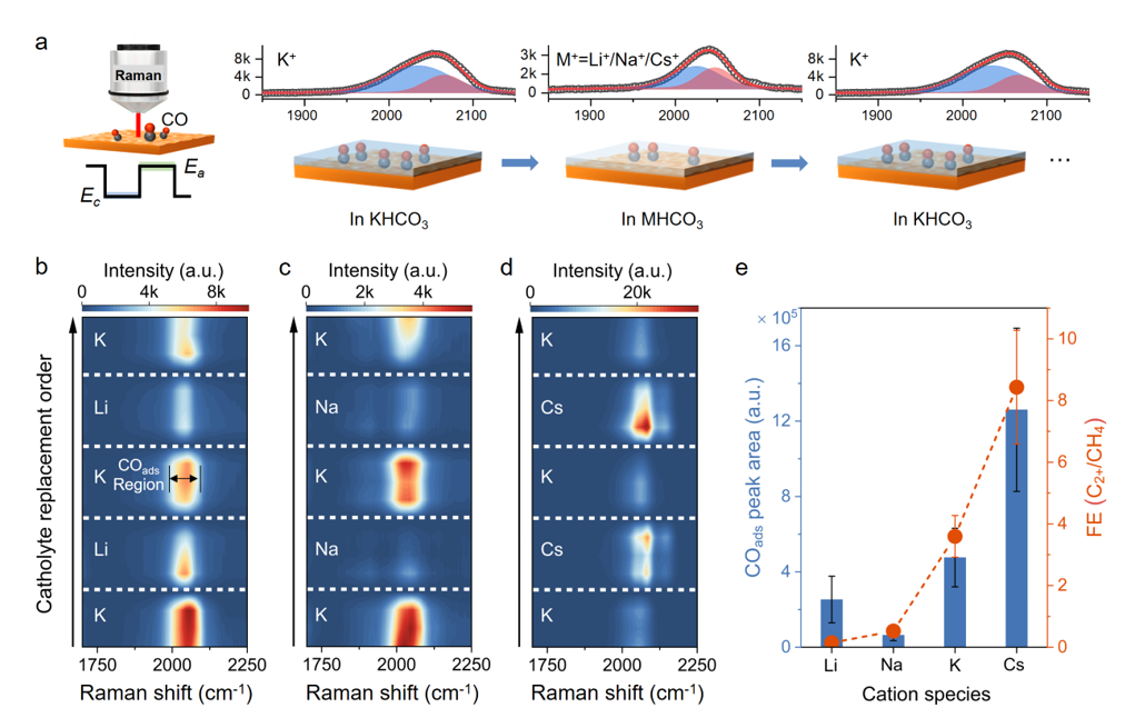 图4. 在不同阳离子环境下,脉冲CORR过程中,Cu上COads的原位拉曼测试。(a) 电解质溶液置换拉曼测试示意图;(b-d) LiHCO3 (b)、NaHCO3 (c) 和CsHCO3 (d)中COads强度变化结果;(e) 不同阳离子条件下的COads浓度变化,红虚线为C2+与CH4的FE比例。