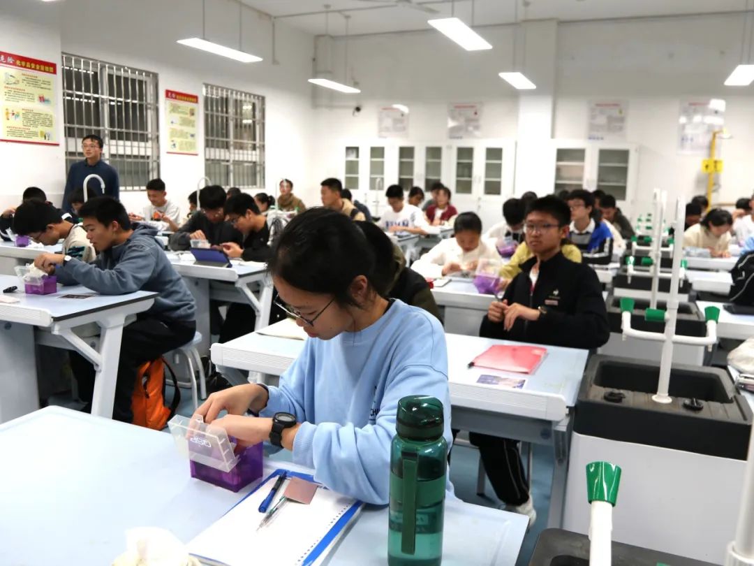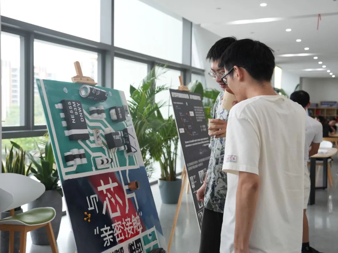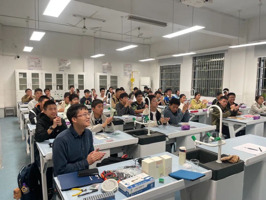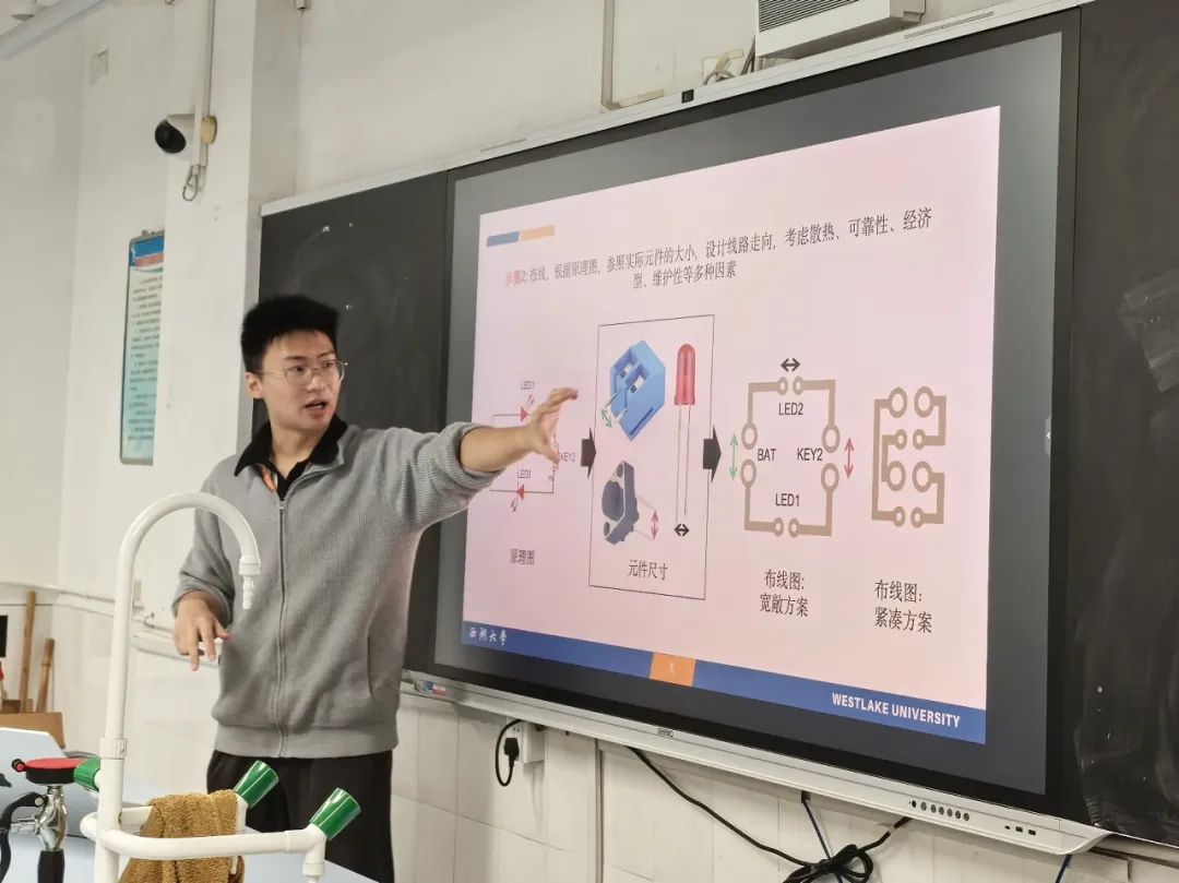 11月10日,西湖大学西小理科普团成员、工学院博士生胡家鸣和袁誉博前往宁波镇海中学,给镇中学生带来《与芯片“亲密接触”》的主题科普课程。他们讲解集成电路的基本特点和发展历程,同时把课堂化作“集成电路生产线”,同学们在课堂上分组担负设计、测试、蚀刻、焊接等不同工序,互相配合“手搓”电路板。