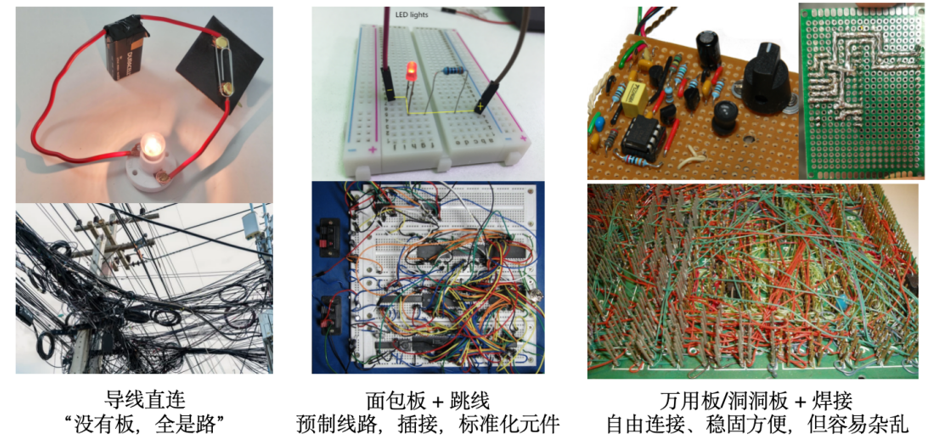 随着所需结构和功能更加复杂,电路的连接面临越来越大的挑战。早期人们普遍单独制造电路元件和导线,这些单独制造的元件叫做分立元件,它们只有和导线相连才能发挥作用。就拿点灯来说,如果只点一盏灯,直接找两根回形针将电源两头与电灯相连即可(有风险,勿轻易尝试哦);而如果给一整栋楼的房间点上百盏灯,则需要使用大量电线,并尽量紧凑的排列在一起;若想进一步加入光、声感应、智能语音控制、远程开关等功能,则需要更复杂的电路连接更多的元件。为了制造维护方便、质量可靠,人们将分立元件按照一定布局紧密的焊接在绝缘的板材上,并用金属导线按照电路结构相互连接,就构成了最基础的(跳线)电路板。