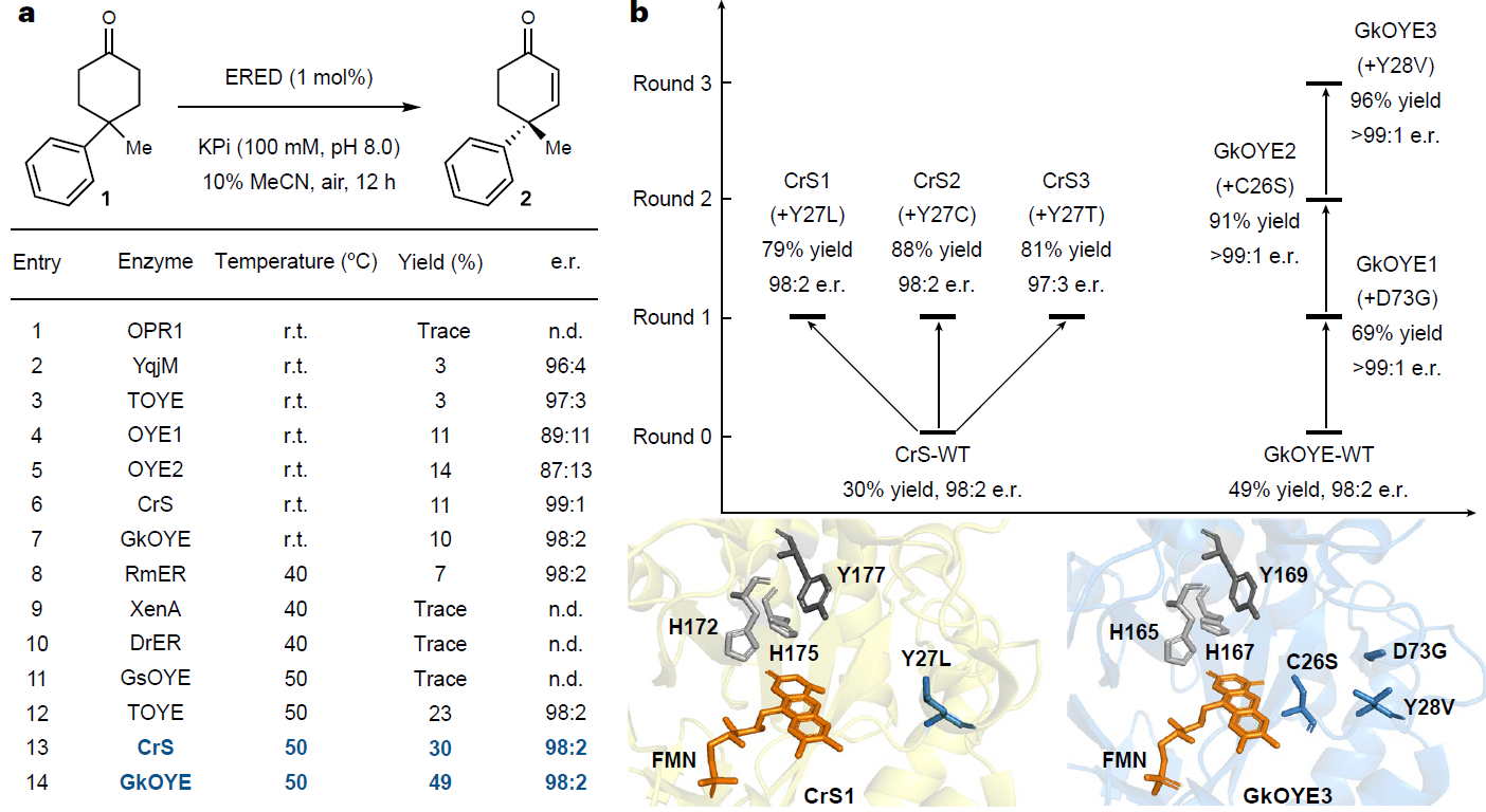 图1. GkOYE和CrS作为去对称去饱和化酶的反应发现和定向进化。a,在研究了一组EREDs并优化了反应条件后,GkOYE和CrS是用于该反应的两种最佳酶;b,一轮ISM产生CrS变体,以高产率和高水平的对映选择性催化去饱和。三轮ISM得到的GkOYE3,以96%的收率提供了所需的产物2,> 99:1