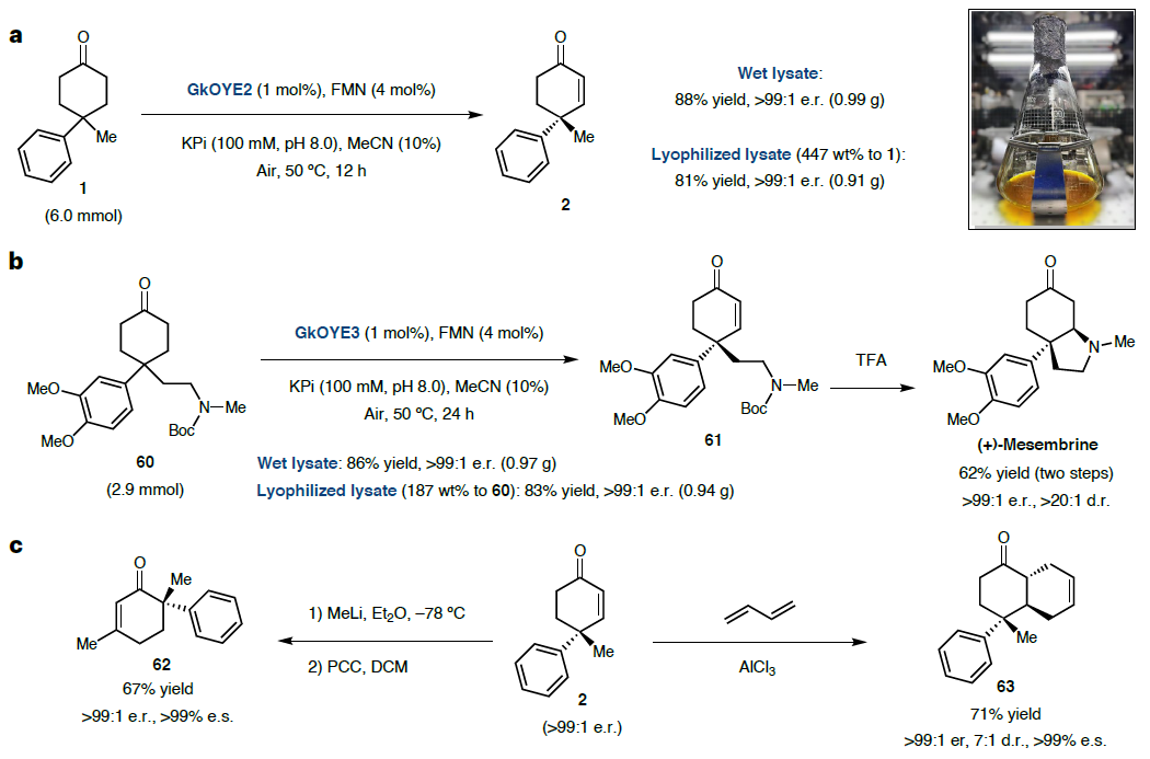 图2. a 该酶促反应可以以高产率和优异的对映选择性水平放大纸克级规模。照片中展示的是克级反应装置;b (+)-Mesembrine的有效制备。关键的去饱和化步骤步骤以86%和83%的克级产率(> 99:1 er)实现;c 通过酶去饱和作用获得的产物进一步衍生为具有高水平对映体特异性的有价值的复杂分子
