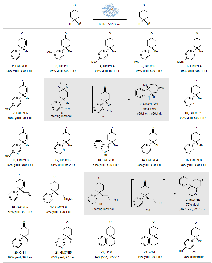 作者首先建立了结构多样的烯还原酶库,以4-甲基-4-苯基-环己酮作为模型底物,在氧气存在的条件下对ERED的脱氢反应性进行评估,发现CrS和GkOYE表现出较好的活性和对映选择性控制。当温度升高时,去饱和化反应性提高。随后作者以野生型CrS和GkOYE为起点,利用定向进化技术提高酶催化剂的反应效率。单突变体CrS1 (Y27L)、CrS2 (Y27C) 和CrS3 (Y27T) 分别以79% (98:2 er), 88% (98:2 er)和81% (97:2 er) 得到烯酮产物;GkOYE-WT经过三轮进化得到一个三重突变体GkOYE3 (D73G、C26S、Y28V),可以以很高的效率催化去饱和化产物的生成 (96%,>99:1 er)。在此基础上,作者收集了在定向进化中获得的有益突变体,对含有多种取代基的环己烯酮底物进行了底物兼容性考察,共55个底物在这一生物催化平台下大多能以较高的产率和高水平的对映选择性得到产物。此外,该方法能够放大至克级规模并且不损失对映选择性。并且这一创新的催化方法可以应用于(+)-Mesembrine不对称合成中的关键手性中心构建。通过酶促去饱和化过程制备的环己烯酮产物能够高立体特异性的转化为有价值的羰基转位产物,或是经历底物控制的非对映选择性Diel-Alder反应,生成了带有三个相邻立体中心的六氢萘酮。