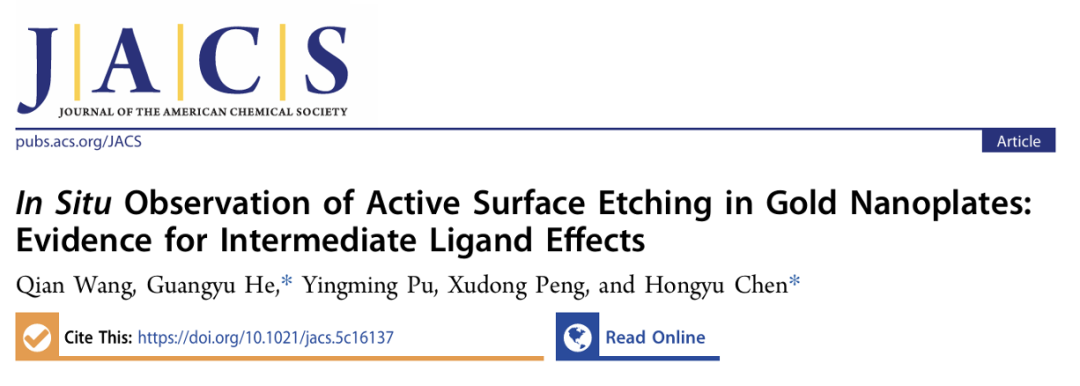 近日,西湖大学理学院化学系陈虹宇课题组在JACS上发表了题为“In Situ Observation of Active Surface Etching in Gold Nanoplates: Evidence for Intermediate Ligand Effects”的研究论文。