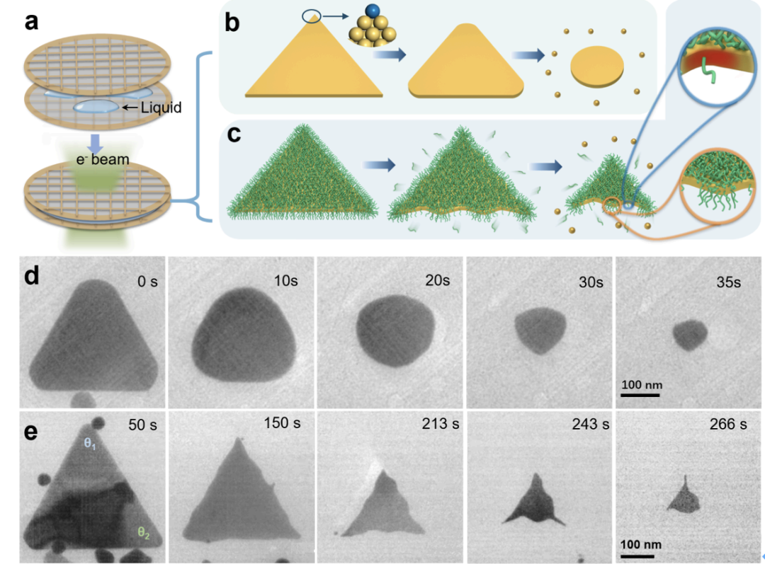 近年来,原位液相电镜技术持续发展,研究者可以在溶液环境中实时观察纳米颗粒生长、刻蚀等转化过程,这为理解非平衡条件下的结构演化提供了全新视角。本研究以金纳米三角片为研究模型,在石墨烯液体池中引入氯化铁作为刻蚀剂,通过液相透射电子显微镜对其形貌演化过程进行实时追踪(图1)。