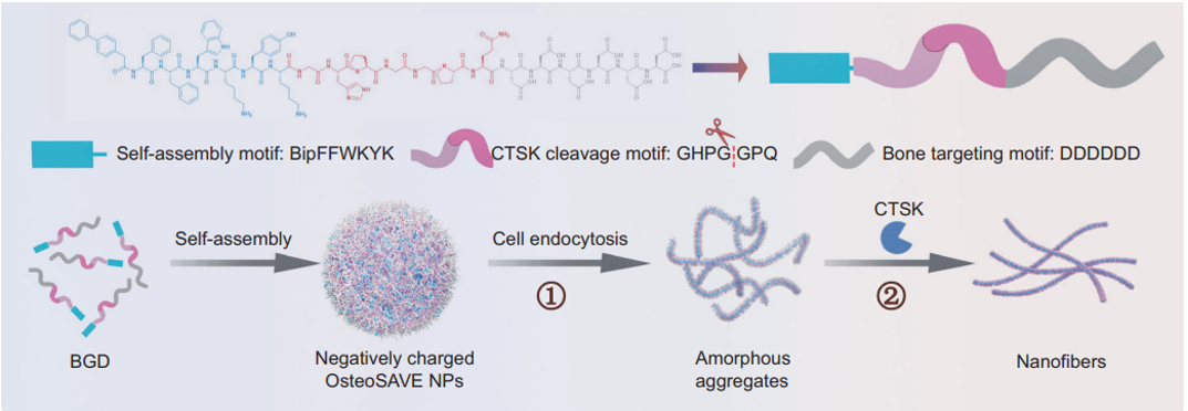 近日,西湖大学王怀民研究员团队在Nature Communications上发表题为“Bone homeostasis regulation by in vivo generation of osteoclast-derived apoptotic bodies using targeted self-assembly”研究论文。基于该团队在溶酶体稳态调控方面的积累,结合骨质疏松疾病的分子机制,从头设计了一种名为 OsteoSAVE(亦称BGD) 的自组装多肽体系,该系统可在体内选择性靶向成熟破骨细胞并进入到溶酶体,进而破坏溶酶体稳态,诱导成熟破骨细胞凋亡,其凋亡过程中产生的凋亡小体促进骨形成,从而实现“破骨清除-成骨再生”的双重治疗目标,实现骨质疏松症的治疗。