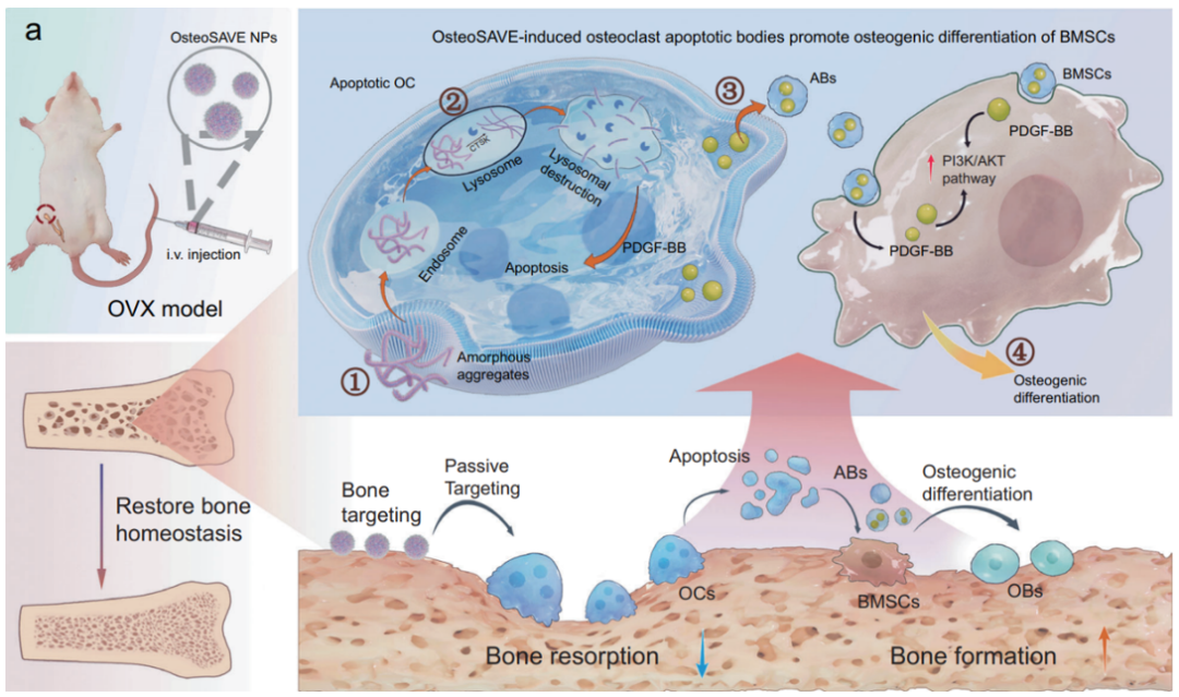 (从左至右:骨靶向→破骨细胞摄取→CTSK触发自组装→溶酶体破坏→细胞凋亡→凋亡小体释放→BMSC摄取→成骨分化)