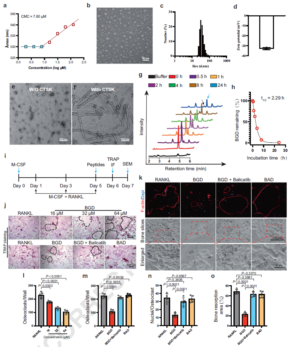 为了评估BGD的酶响应性性能,在BGD中添加CTSK(800 ng/mL)后,BGD发生酶切并自组装形成纳米纤维。液相色谱-质谱联用(LC-MS)分析显示,完整BGD逐渐降解,并出现与酶切产物Bip-FFWKYKGHPG对应的特征峰,酶切半衰期为2.29小时。