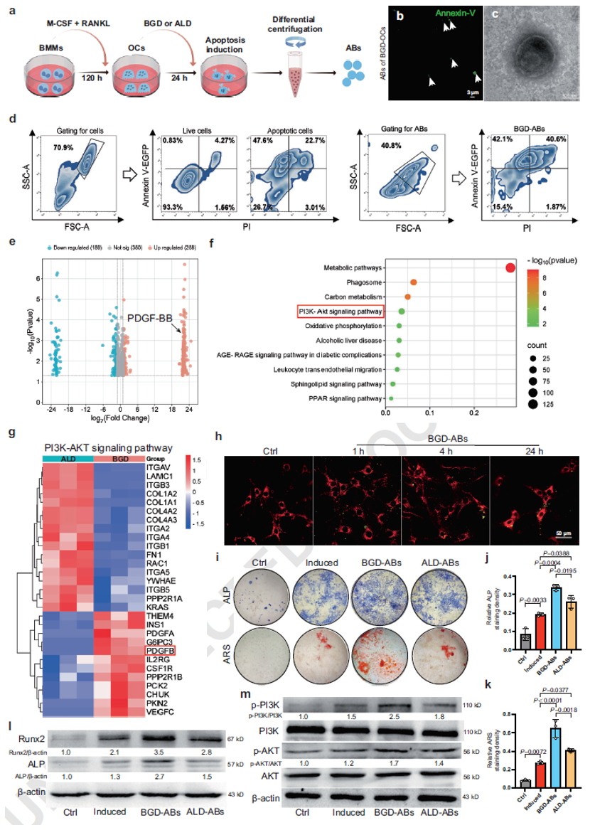 为验证凋亡小体在成骨分化中的作用,作者将BGD-ABs与BMSCs共培养,显示BMSCs对ABs的摄取呈时间依赖性。通过染色与Western blot证实,BGD-ABs与ALD-ABs均能诱导成骨分化,且BGD-ABs的成骨潜能更高,这一差异可能归因于BGD-ABs中更高的PDGF-BB含量。此外,BGD-ABs能显著激活PI3K/AKT通路。
