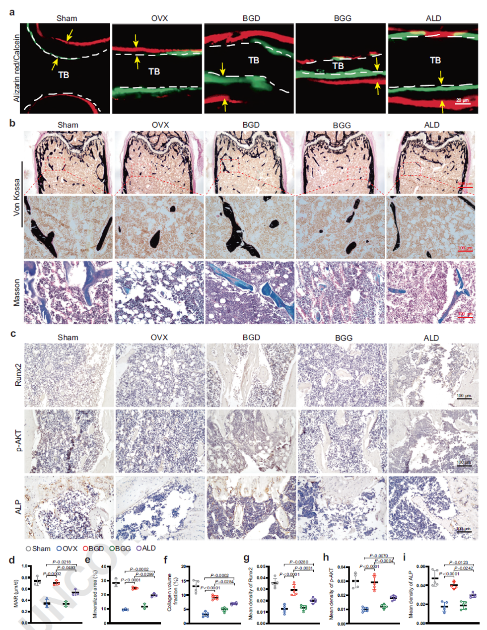 为探究BGD在体内对骨稳态的调控作用,作者在卵巢切除(OVX)术后第5周对小鼠分别给予BGD、BGG及ALD治疗。通过茜素红/钙荧光染色双标、Von kossa、Masson等实验证实,与OVX组、BGG组及ALD组相比,BGD组骨形成能力显著增强。免疫组化染色表明,BGD组中磷酸化AKT(p-AKT)、Runx2、ALP及VEGF的阳性表达最强,提示其同时激活了成骨与血管耦联系统。相比之下,BGD组中破骨细胞活性标志物CTSK的表达水平最低,表明骨吸收过程受到显著抑制。