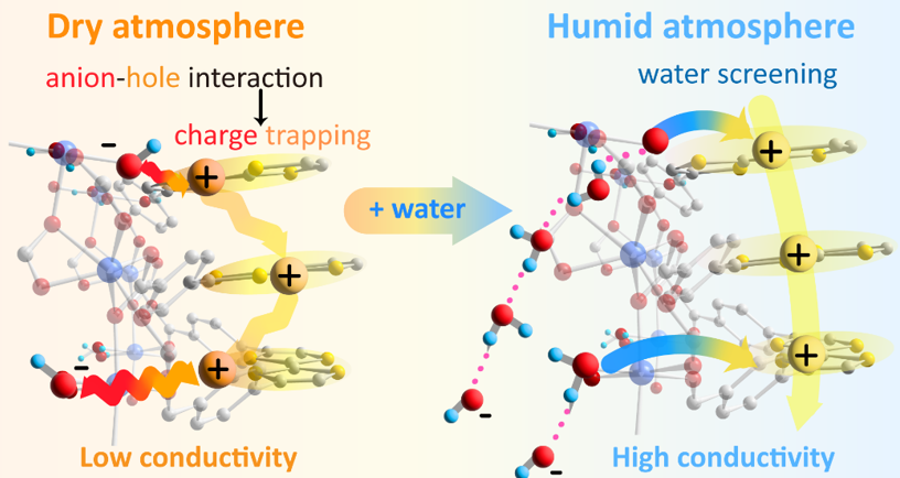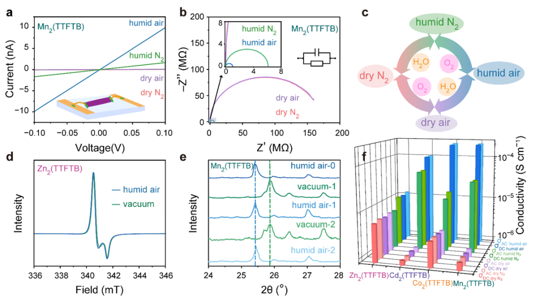 上述结果表明,水引起的电导率增强可以归因于水对电荷陷阱的屏蔽作用(图1)。M2(TTFTB)中的载流子为TTF·+阳离子自由基,其形成应伴随着氢氧根、羧酸根或硝酸根等阴离子以保证电荷平衡。在干燥环境中,它们由于库仑吸引力形成空穴-阴离子对,空穴的捕获降低迁移率和电导率。在湿润环境中,吸附的水分子可以与阴离子自发形成氢键,使得阴离子远离TTF·+;同时,孔道中水分子提供了一种介电常数比N2高得多的介质。这两种因素协同减弱TTF·+阳离子自由基与阴离子之间的库仑相互作用,从而抑制空穴捕获效应,提高空穴迁移率,进而提升电导率。