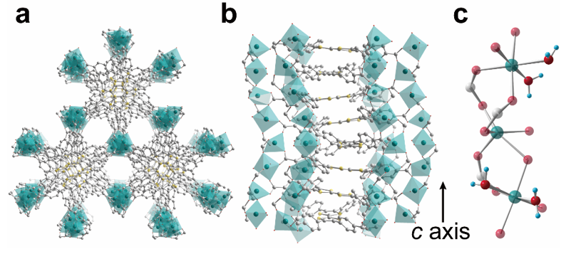 作者选取了一系列兼具微孔和导电性的同构MOFs,M2(TTFTB),对其单晶化学电阻传感性能及机制进行了研究。这些MOFs 在优化的合成条件下可生长为毫米级的单晶,沿c轴长程π堆叠的TTF柱提供电荷传导通路,TTF在空气中氧化形成TTF·+阳离子自由基提供空穴,二者协同促进电导。此外,结构中配位水和金属-羧酸链有可能提供质子和质子传输路径(图2)。结构上的多重优异性预示着这类材料可能可以用于电荷传输机制的深层探索。