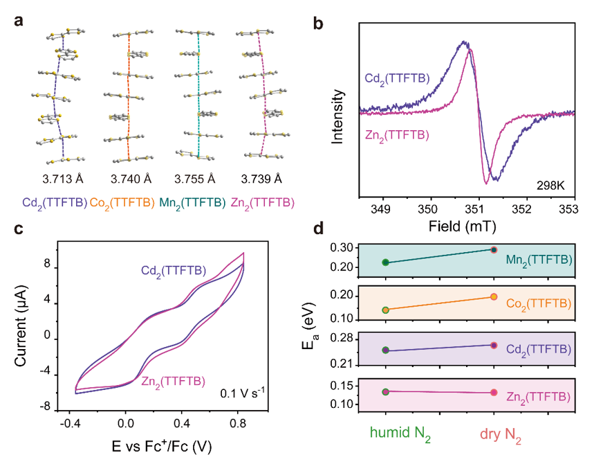 团队研究了一系列同构金属有机框架(MOFs)——M₂(TTFTB)(M²⁺ = Mn²⁺、Co²⁺、Zn²⁺、Cd²⁺;TTFTB⁴⁻ = 四硫富瓦烯四苯甲酸根)的单晶化学电阻湿度传感,克服了多晶薄膜中晶界散射和随机晶体取向的局限性,并对其电荷传输机制和传感机制进行了系统研究,发现了孔道中溶剂屏蔽效应对电导率具有显著的提升作用。作者发现这些材料的电导率受到TTF·+阳离子自由基缺陷与平衡电荷的阴离子之间库仑相互作用的强烈影响:在干燥条件下,此相互作用导致载流子被束缚;在湿润条件下,孔道中吸附的水分子屏蔽了空穴-阴离子相互作用,使得载流子回归电荷传输通路,从而显著提高了电导率(σ)。此机制很好地解释了M2(TTFTB)对水的化学电阻响应和Zn₂(TTFTB)的独特响应行为,为金属中心的库仑势与溶剂屏蔽效应之间的关联提供了直接实验证据,为未来高性能导电MOFs的研发提供了设计原理。本研究采用的多维度表征策略建立了探索MOFs中电荷传输机制的通用方法,并为高性能化学电阻传感器的精准设计提供了指导原则。