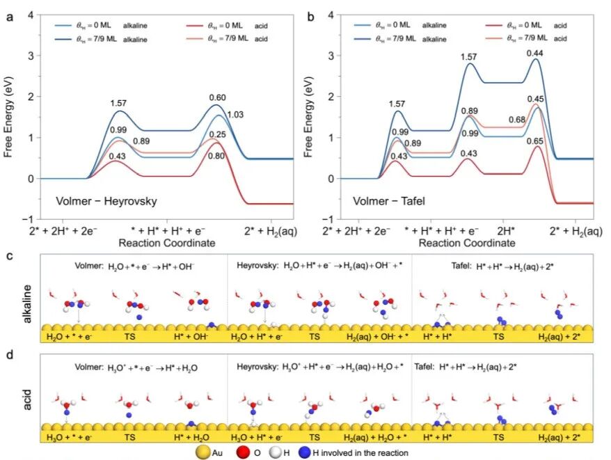 图2.HER反应自由能图及反应机理。在标准氢电极(SHE)电位下,以H₃O⁺(酸性条件)和H₂O(碱性条件)作为质子源时,Au(111)在无H覆盖(θ*H=0 ML)及高H覆盖度状态(θ*H =7/9 ML)下的Volmer-Heyrovsky路径(a)与Volmer-Tafel路径(b)的巨正则自由能图以及(c)Volmer-Heyrovsky机理与(d)Volmer-Tafel机理的反应过程示意图。