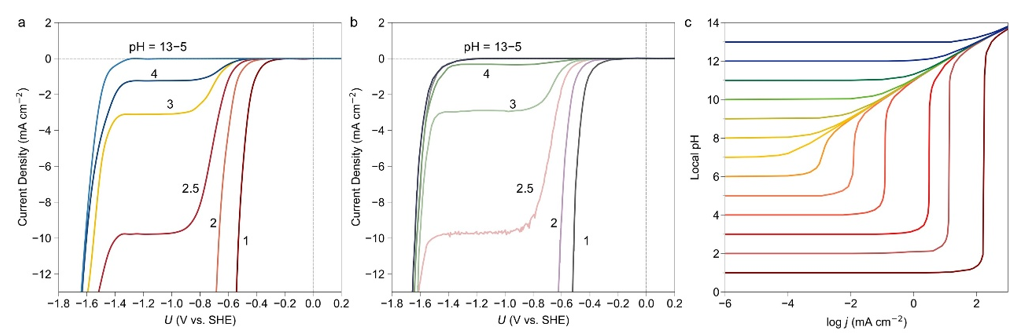 图3.多尺度模拟与实验获得的HER极化曲线。 (a) 多尺度模拟与 (b) 实验获得的Au(111)表面HER电流-电位极化曲线。(c)全pH条件(体相pH=1-13)下局部pH随电流密度变化的函数关系图。