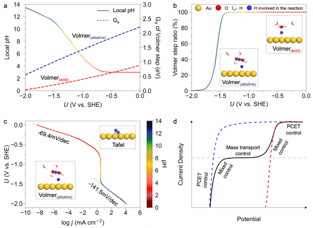 基于上述系统的反应机理模拟,将获得的HER反应自由能信息代入图1b所示的多尺度模拟框架进行迭代求解后,便成功模拟出Au(111)表面上HER的电化学极化曲线(图3a),并且呈现出与实验测量极化曲线的高度吻合性(图3b),进而证明该多尺度模拟框架的有效性。