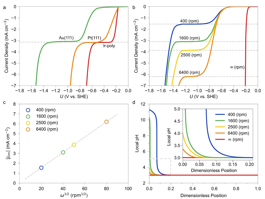 图5.宏观传质对极化曲线的影响。(a)实验测得的Au(111)、Pt(111)及多晶Ir催化剂在pH=3条件下的极化曲线,三者均呈现出相似的极化平台。(b)不同转速下Au(111)表面在pH=3时的模拟极化曲线,展现出不同的平台电流。(c)扩散极限电流密度绝对值与转速平方根(ω1/2)的线性关系。(d)局部pH随转速的变化关系。