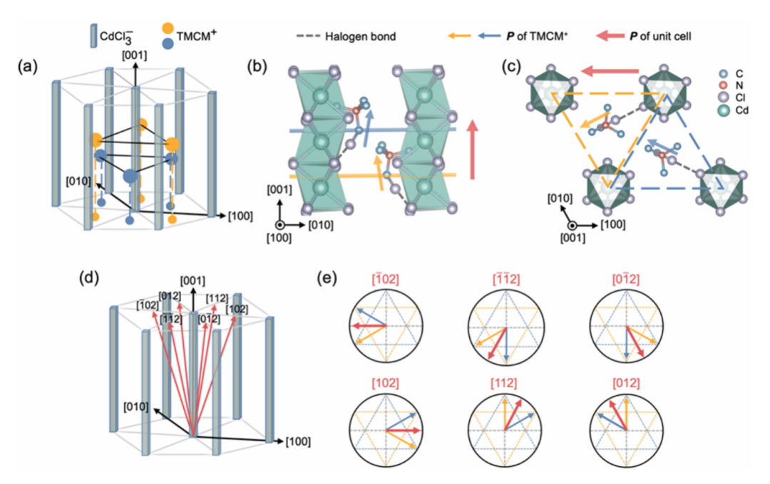 图1.TMCM-CdCl3 晶体结构及极化分布。(a-c) 晶体结构的立体、侧视及俯视示意图;(d-e) 体系可能的空间极化方向及其对应的平面投影。