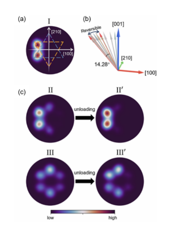 基于完整的压电张量,团队进一步分析了巨压电效应的来源。分析表明,实验上观测到的巨压电响应并非源于晶格原本的纵向分量d33(约14 pC/N),而主要归因于巨大的剪切分量d15(约163 pC/N)。进一步的动力学结构分析揭示了d15的微观起源。这一效应并非源于宏观尺度上的相变或极化矢量的连续旋转,而是由对称性约束下有机分子的离散跳跃式旋转所驱动。在较小的剪切应力作用下,由于局域势能面中的C₃对称性被破坏,部分有机分子能够克服势垒,在平面内发生 120° 的离散旋转,从一个较高能量的势阱跳跃至另一个较低能量的势阱,导致显著的极化变化。这一微观机制正是材料中巨压电效应的根本起源。值得注意的是,在临界应力范围内,仅有少部分有机分子发生跳跃式旋转。这种局部的微观扰动表现出类似“形状记忆”效应的可逆性:一旦撤去应力,这些分子便会受环境约束跳回初始取向,从而保证了整体压电响应的可逆性(图2)。