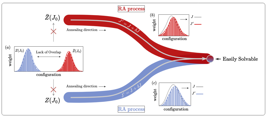 课题组提出的“双组份重赋权退火(BRA)”框架为解决量子蒙特卡洛模拟中的核心难题提供了新思路。该方法的创新在于将任意观测量的期望值⟨O⟩表示为两个配分函数的比值形式,这一构造使得原本难以直接计算的物理量可以通过分解为两个独立部分分别处理。BRA方法的核心技术路径是沿着精心设计的连续路径对分子和分母同时进行退火重赋权采样,如Fig.1彩色路线退火所示。这一过程建立了一个系统的插值路径,将目标物理量的计算连接至一个易于求解的参考点, 如图1参考点(easily solvable)所示。参考点的选择具有灵活性,可以是小规模系统、高对称性点或可精确求解的自由理论极限等情况。 该设计的显著优势在于成功规避了传统QMC中的“零重叠”障碍,将原先难以处理的复杂比值,转化为一系列渐进、可计算的相邻比值。这一转变使得研究者能够通过连续变化的中间状态,系统性地探索物理量的演化行为,为研究传统方法难以处理的强关联系统开辟了新途径。尤为重要的是,该方法具有高度的通用性与灵活性,适用于不同模型、维度、观测量形式及QMC实现方式。研究团队在XXZ模型与横场Ising模型中成功实现了多项过去难以完成的测量,包括: