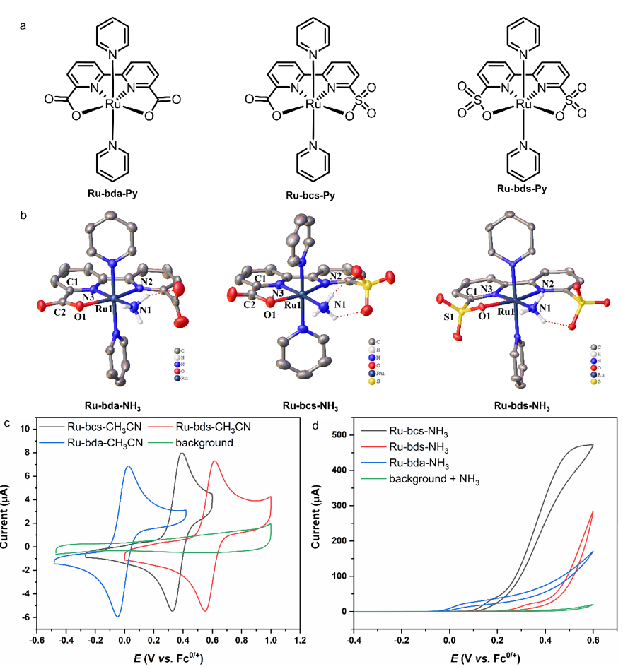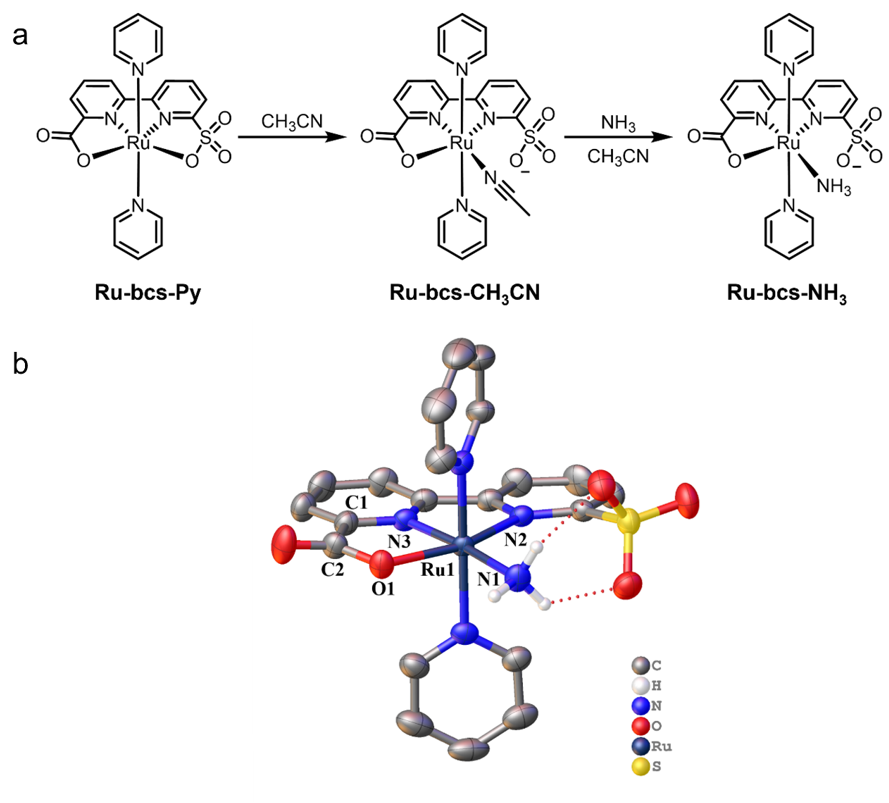 针对这一问题,研究团队独辟蹊径,设计了一种名为“bcs”的混合配体(bcs:2,2'-联吡啶-6-羧酸根-6'-磺酸根),并成功制备了相应的钌配合物,[Ru(bcs)(pyridine)2](Ru-bcs-Py)。在氨存在下,该配合物发生关键的结构转变:bcs配体中的磺酸基解离打开,而羧基保持配位,从而形成了具有高活性的氨配位中间体[Ru(bcs-κ3O,N,N)(Py)2(NH3)](Ru-bcs-NH3)。