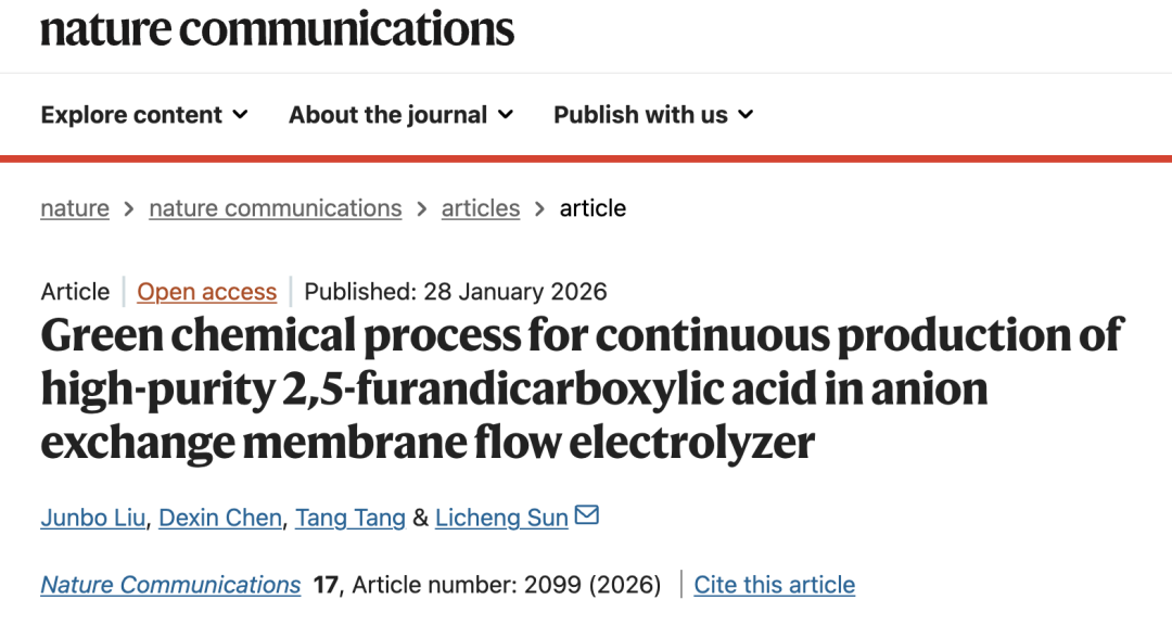 Junbo Liu, Dexin Chen, Tang Tang & Licheng Sun. Green chemical process for continuous production of high-purity 2,5-furandicarboxylic acid in anion exchange membrane flow electrolyzer. Nature Communications (2026).