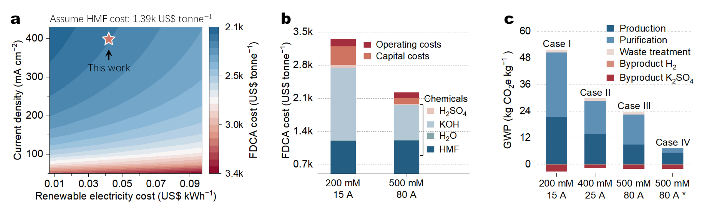 图2. (a) 基于AEM-HMFOR技术的FDCA生产成本估算(受电流密度与电价影响);(b) 两种典型情景下的详细成本构成;(c) 四种生产情景下FDCA的全球变暖潜势(GWP)对比。