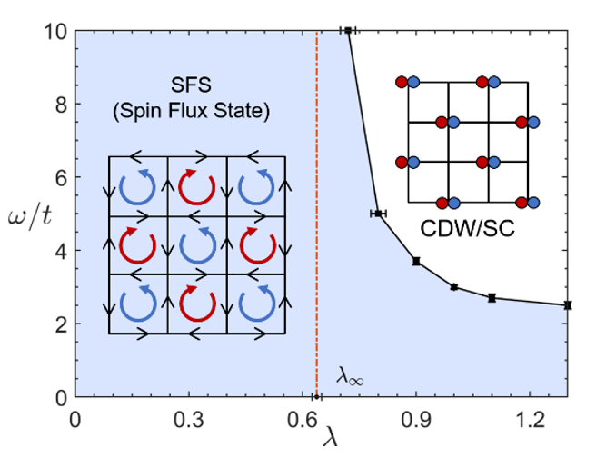 他们所使用的是蒙特卡洛算法。量子蒙特卡洛是吴从军研究组的主要方向之一,在过去的十几年中,他们在量子蒙特卡洛的费米子符号问题,以及在高对称性哈伯德模型方面做出过重要进展,深受凝聚态物理领域的关注。2022年,系统学习半年后,吴从军指导张翔宇借助这一工具,尝试处理声子和电子自旋耦合的问题。